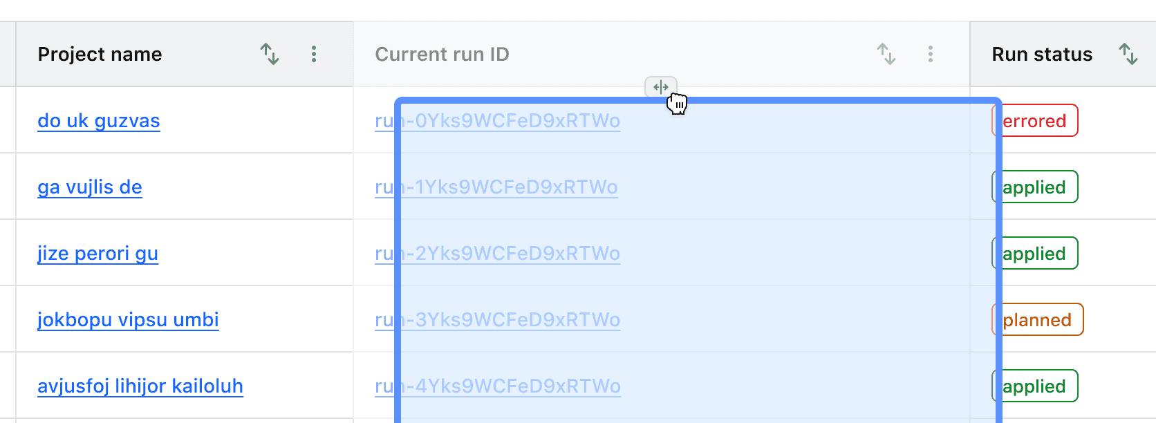 When resizable columns are enabled, actions related to each function are rendered in a context menu in the table header. These functions are not customizable.